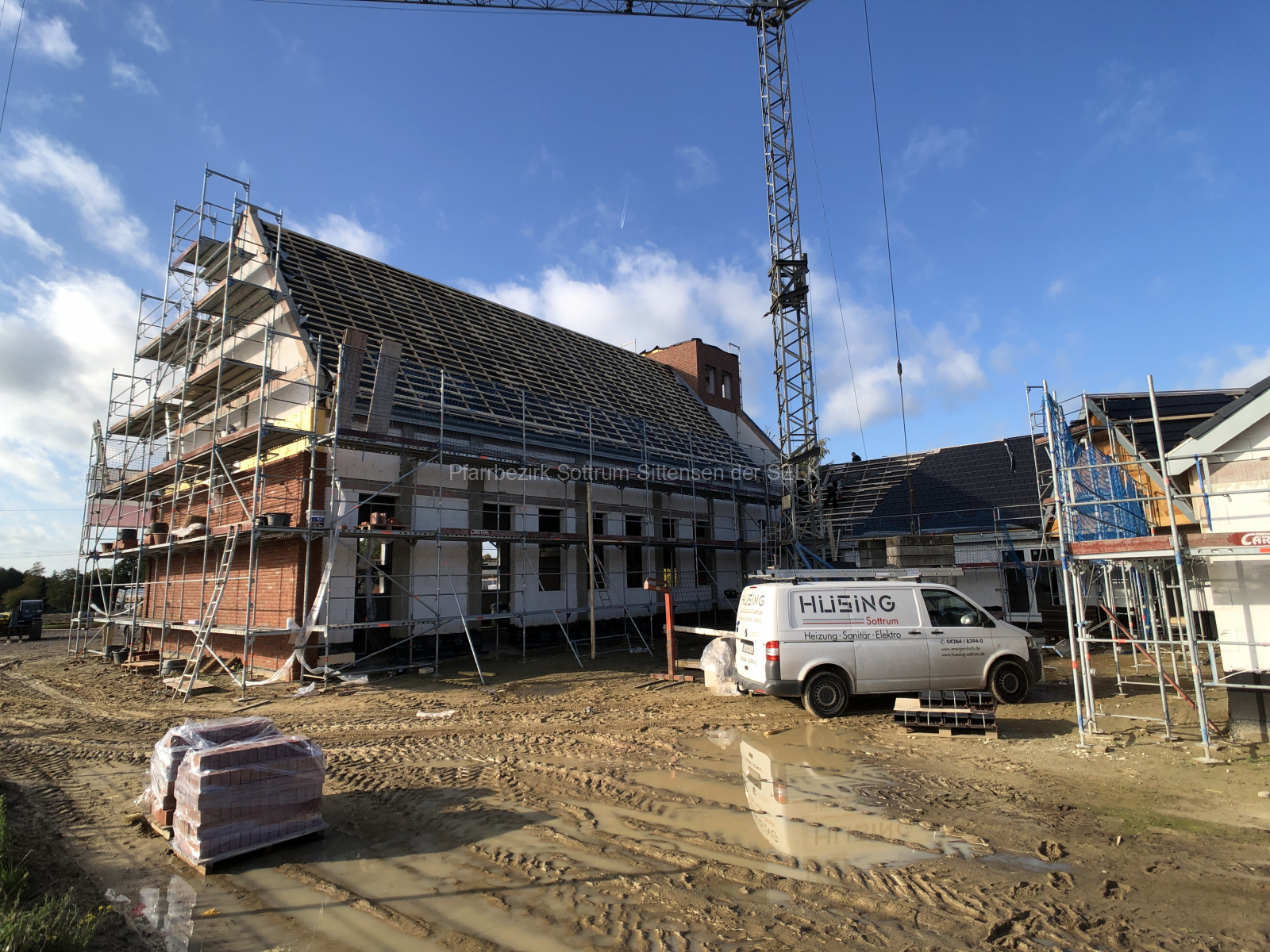 Aber was genau ist seitdem passiert. Man kann eigentlich sagen: „Die Kirche steht!“. Na ja so fast. Zumindest äußerlich fehlt nur noch das letzte i-tüpfelchen in Form des Turmdachs. Dieses steht aber bereits als Holzkonstruktion auf dem Boden und wartet nun darauf, durch die Dachdecker vollendet zu werden.